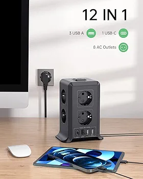 این چندراهی مجهز به ۸ پریز برق AC و ۴ پورت USB (شامل USB-A و USB-C) است که امکان اتصال همزمان انواع لوازم برقی، لپتاپ، کنسول بازی، مودم، شارژر موبایل و تبلت را بدون نیاز به آداپتور اضافی فراهم میکند. وجود کابل برق ۵ متری انعطافپذیری بالایی در جانمایی دستگاه به شما میدهد و برای فضاهایی که پریز از محل کار فاصله دارد، بسیار ایدهآل است.